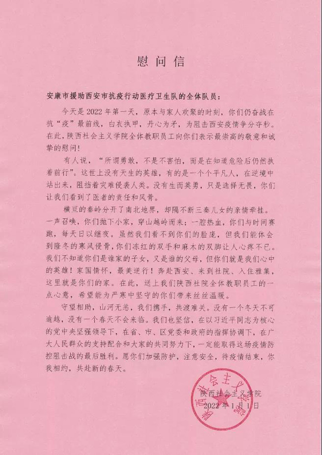 新年伊始,爱满三秦!2022年第一天,入住雅集酒店的120名援助西安抗疫的安康市医护人员,每人都收到了一封代表陕西社会主义学院全体教职员工心意的慰问信和保暖用品、小食品等爱心礼物。